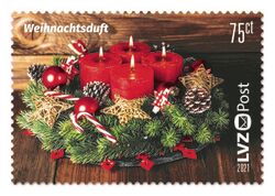 Bei der LVZ Post duften in diesem Jahr nicht nur die selbst gebackenen Plätzchen der Mitarbeiter ganz besonders gut, sondern auch die Weihnachtspost: Die neue Briefmarke, für die ein hübsch geschmückter Adventskranz als Motiv gewählt wurde, duftet nach Tanne. Auf das Papier wurde dafür ein spezieller Duftlack aufgetragen.