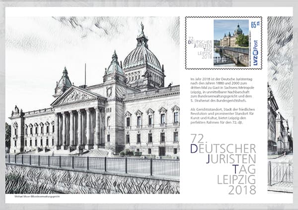 Am 13. April 2018 fand die Auftaktveranstaltung des 72. DJT im Paulinum statt. Hier wurde bekannt gegeben, welche Themen vom 27.-28. September 2018 beim größten europäischen Rechtskongress zwischen den Teilnehmern aus Justiz, Politik, Wissenschaft und Wirtschaft diskutiert werden. Das Team der LVZ Post war vor Ort und empfing alle Briefmarkenfans und alle anderen Postinteressierten am LVZ Post-Stand. Es erschien eine 65 Cent-Briefmarke und ein Schmuckbogen, foliert auf einem repräsentativen Folder.