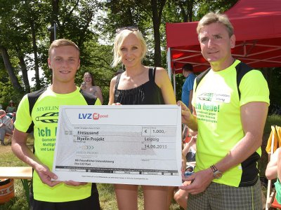 Unermüdlich moderierten Mike Riemann und Thomas Künzel die verschiedenen Stationen sowie die Showeinlagen der L.E. Dancers und die Auftritte von Richard Istel und Anna Prütz. Höhepunkte waren die Scheckübergaben von James Parsons über 350 Euro, von den Leipziger Finswimmern über 235 Euro und von der LVZ Post über 1.000 Euro. Diese wurden von Schirmherr Marvin Kirchhöfer und den Myelin-Sportbotschaftern Jan Benzien und Christian Kramer gemeinsam mit dem Vorstandsvorsitzenden Dr. Frank Schreiber dankend entgegen genommen. Der Tag klang aus mit Hagen Hering und Maik Dzenudda – oder einfach nur bei chilliger Musik an der Strandbar.