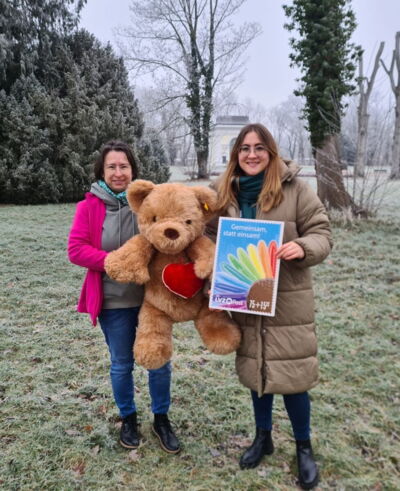 Die symbolische Übergabe der Spende fand im Kees’schen Park vor dem Kinderhospiz statt. Auf dem Foto sind zu sehen: Kerstin Stadler (Assistenz Geschäftsführung Kinderhospiz Bärenherz, Friederike Ehbrecht (Marketing LVZ Post).