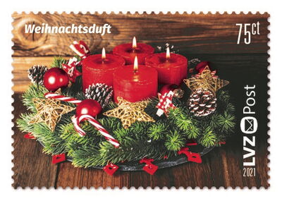 Bei der LVZ Post duften in diesem Jahr nicht nur die selbst gebackenen Plätzchen der Mitarbeiter ganz besonders gut, sondern auch die Weihnachtspost: Die neue Briefmarke, für die ein hübsch geschmückter Adventskranz als Motiv gewählt wurde, duftet nach Tanne.
